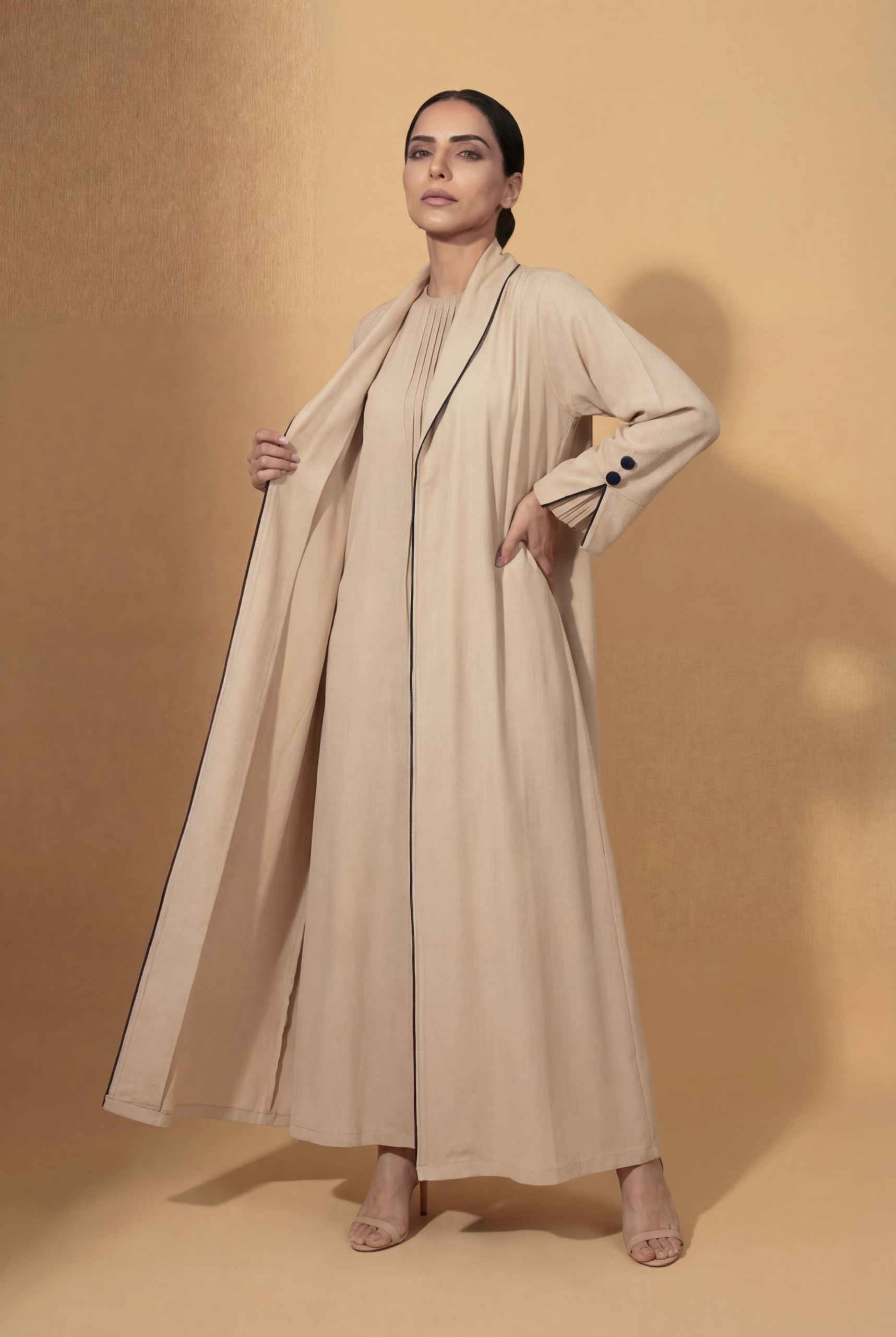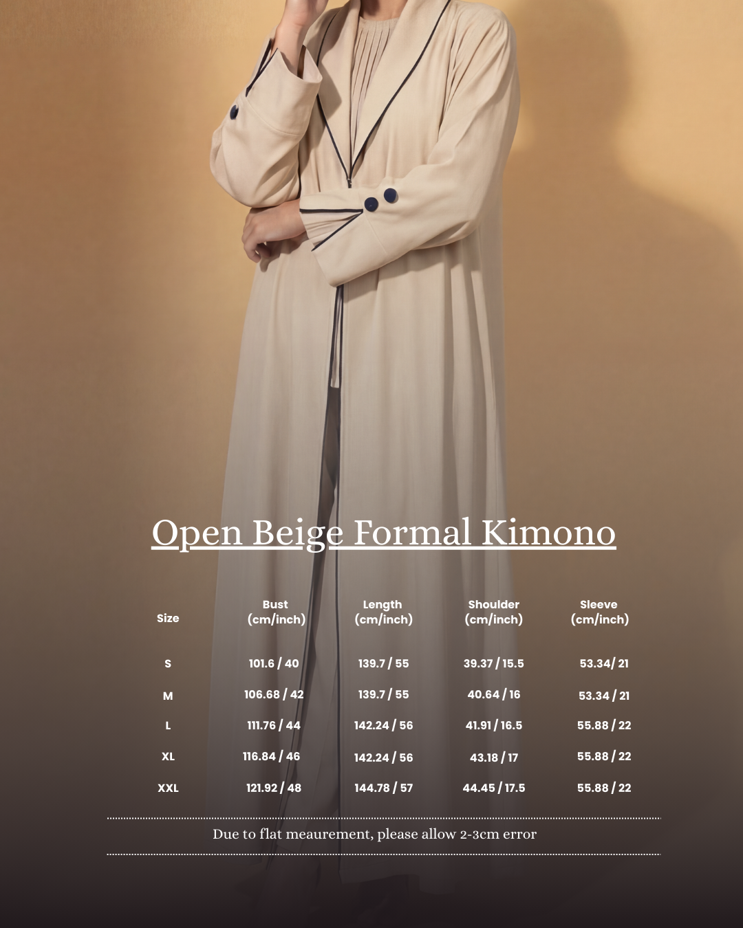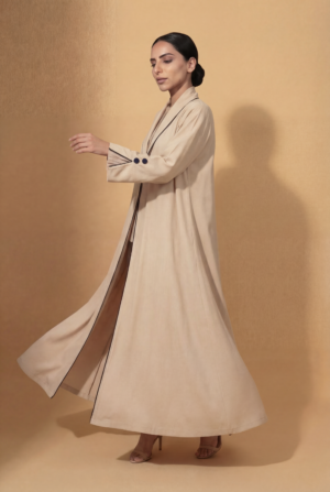 Key Design: Open-front kimono abaya tailored for formal occasions This open kimono abaya is crafted from lightweight crepe polyester, delivering a structured yet fluid silhouette. The elegant beige shade enhances its refined character, making it an ideal choice for sophisticated formal wear.